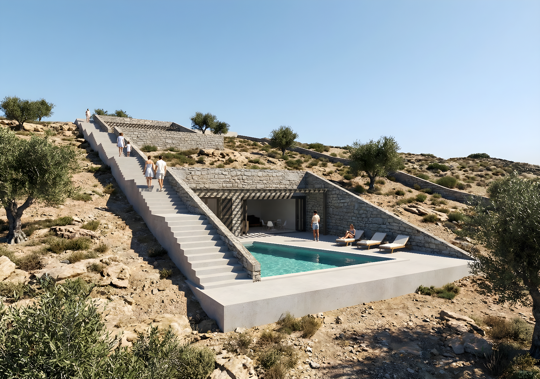 Project Petrousa is a residential development set in the Petrousa area of Kythnos — one of the island's most scenic and secluded enclaves. The concept is simple but rare: bring contemporary architectural thinking to a landscape that deserves nothing less, without ever letting the building overshadow the place. The result is a collection of just three buildings — an intentional scarcity that preserves the natural character of the land and ensures every resident enjoys genuine privacy and unobstructed views.